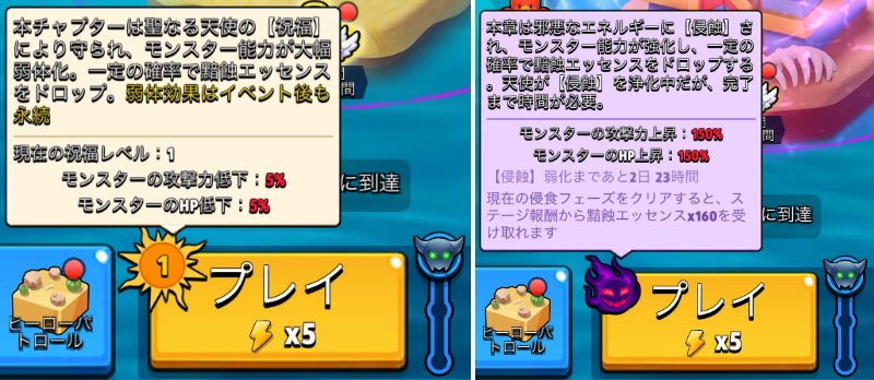 侵蝕が強いうちにクリアするほど大量のエッセンスがもらえるが、該当チャプターの初クリア報酬に追加される形となるため、先に未受け取りの初クリア報酬を全て受け取らないと獲得できない。エネルギー目当てで溜め込んでいた人にはなかなか辛い仕様である。