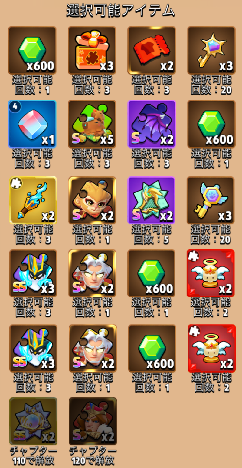 いずれも周回で努力によりトークンを増やせず、技術介入の余地にも乏しいため、実質的には課金によるアイテム販売の側面も濃い。とはいえ、無課金でも賢く立ち回れば1つぐらいは良い賞品がもらえるようになってることが多いようだ。それらのうち、一度限りではないと思われるものについて紹介する。