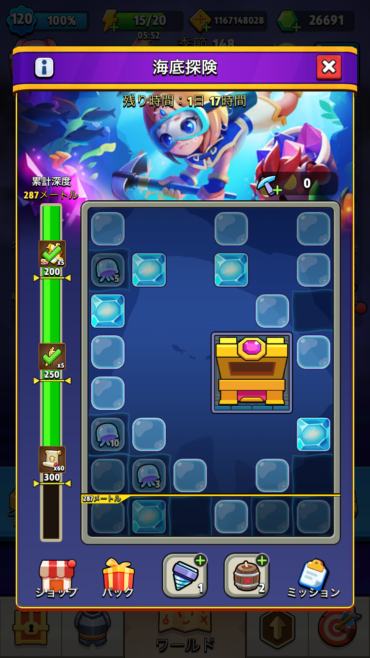 ミッション達成やパック購入などで採掘道具である鍬頭(くわがしら、ツルハシ)・ドリル・爆薬を集めて鉱山/海底を採掘し宝探しをする。アイコンの小さい「+」をタップして毎日一定数までジェムで購入も可能(下表参照)。