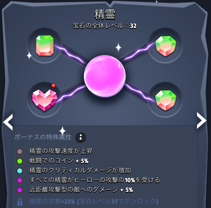 精霊1 | Lv4:スピリットの攻撃速度が上昇 Lv8:戦闘でのコイン+5% Lv16:スピリットのクリティカルダメージが増加(+40%) Lv28:すべてのスピリットがヒーローの攻撃の10%を受ける Lv33:近距離攻撃型敵へのダメージ+5% Lv38:精霊の攻撃+25% Lv45:部屋に入ってから10秒間、精神攻撃(※精霊攻撃?)が25%増加し、弾丸が壁を通過できるようになる Lv52:MP上限+10% |