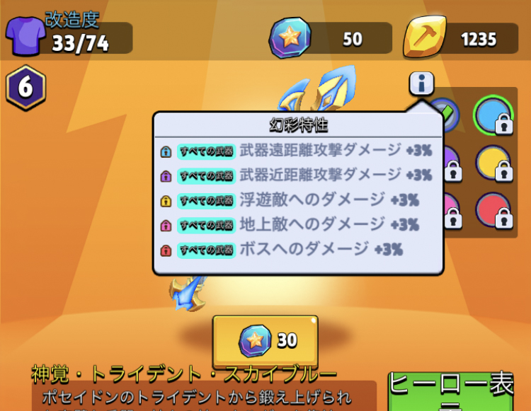 | ゴールド | すべての武器:浮遊敵へのダメージ+3% | 幻彩金星石 30個 | |