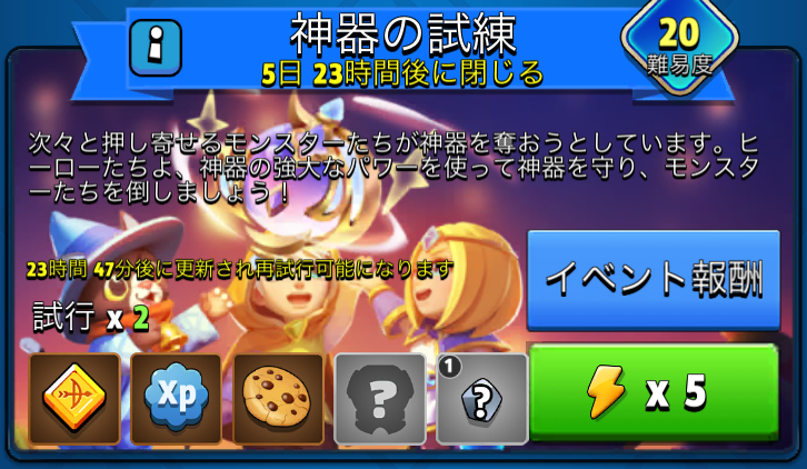 | 回数上限 | 1日2回 (+1回 200ジェム) |