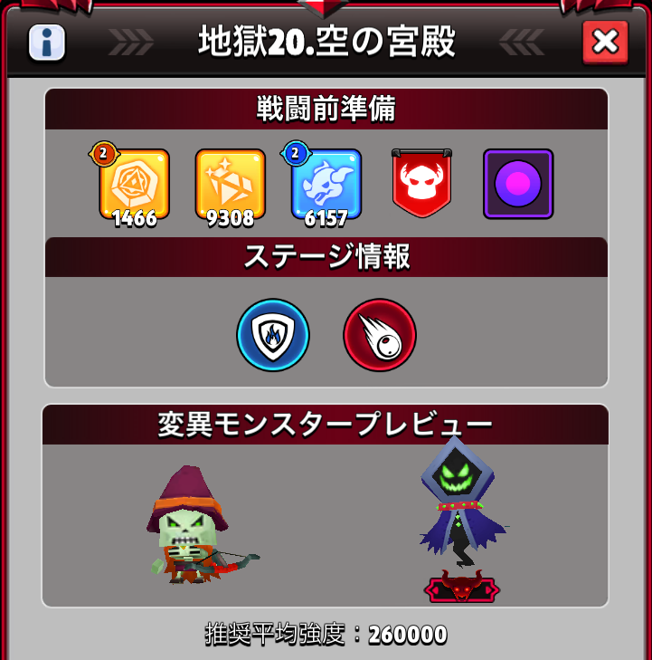 遠征の部屋情報に似た「モンスター情報」があり、チャプターごとに特有のバフがモンスター側に付与されている。また「変異モンスター」という、赤いHPを持つ特別に強化されたモンスターも設定されている。祝福類の右に2つあるアイコンも(デ)バフで、タップで説明が出る。